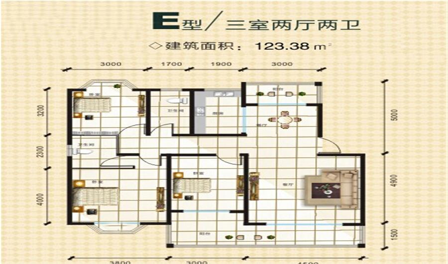 3室2厅2卫-E户型 三室两厅两卫 123.38㎡