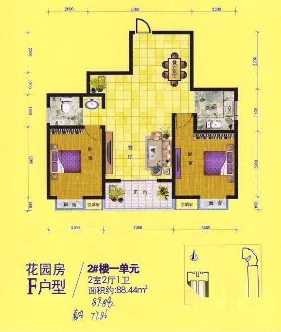 2室2厅1卫-F户型 两室两厅一卫 88.44㎡