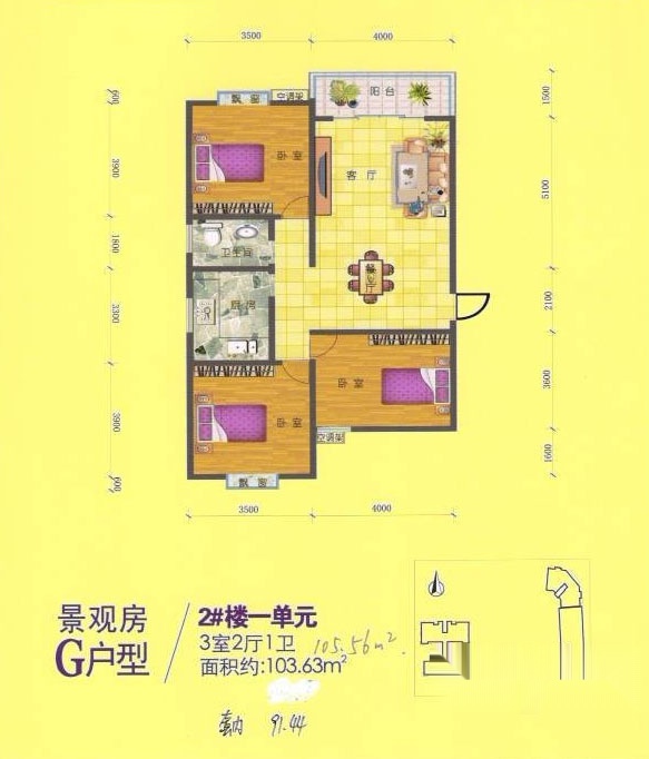 3室2厅1卫-G户型 三室两厅一卫 103.63㎡