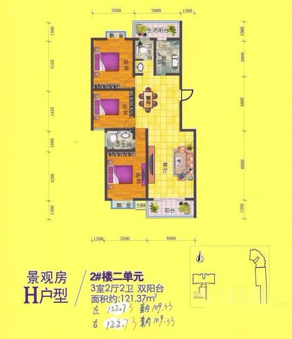 3室2厅2卫-H户型 三室两厅两卫 121.37㎡