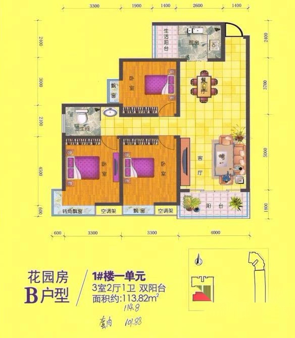 3室2厅1卫-B户型 三室两厅一卫 113.82㎡