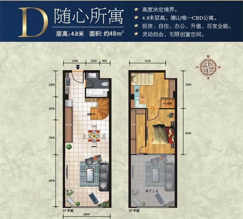 1室1厅1卫-D1 loft户型 一室一厅一卫 48㎡
