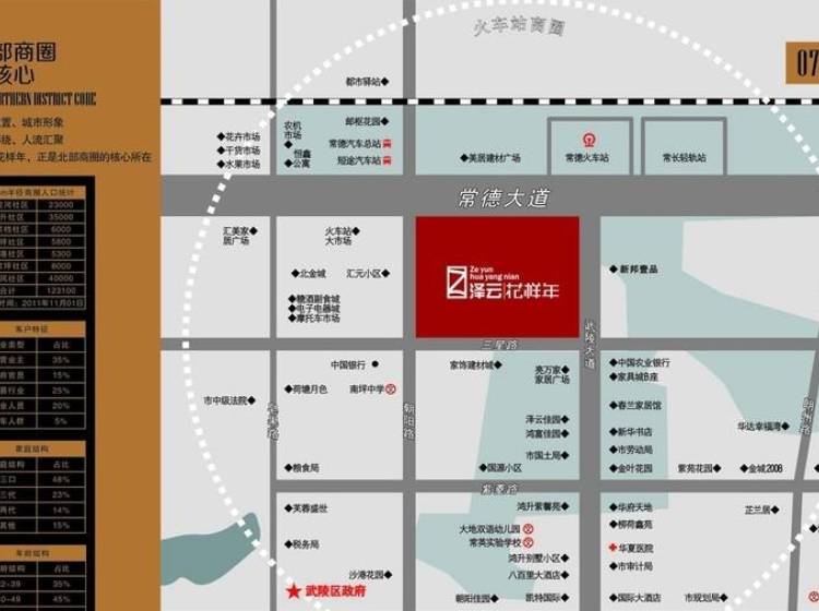 由泽云实业开发的泽云广场,总建筑面积21万平方米。地处火车站商圈板块,位于武陵大道和常德大道两大城市动脉交汇处,南北通达,东西贯通,交通便利。项目位置与常德火车站隔街眺望,是名副其实的常德站。根据北部新城战略,随着常德大道的扩建,火车站复线的修葺,长常城际铁路的启动和各个新型社区及职能部门的建设,将给泽云花样年带来更大的商业价值潜力和发展前景。 泽云广场一期泽云R26;幸福里总建筑面积14万平方米,以住宅为主,已于2010年10月优质收官。二期泽云R26;,为复合型商业项目。整体规划有时尚高级住宅、高档酒店公寓、集中复合型商业以及国际风情步行街区。是常德市火车站商圈内集购物、休闲、餐饮、娱乐、居住为一体的高端综合性购物中心。 泽云广场二期泽云R26;花样年于2011年8月10日开始动工,投资额近3.9亿,预计于2012年11月完工。泽云R26;花样年物业型态多样,住宅包括26层的酒店公寓和25层的高端住宅,其中高端住宅176户,以90平米的二房和110平米左右的三房为主。酒店式公寓391户,为50平方米左右的户型。商业总体量近20000平米,包括商场、国际风情步行街和裙楼商铺。商场共四层,总面积13000平米,规划有名品折扣店、大型超市、五星影院等。国际风情街规划有特色小食餐饮、时尚品牌服饰形象店、工厂店,银行、便利店、通讯服务站等社区配套。裙楼商铺规划有大型异域特色美食、主题餐厅、海鲜酒楼等。 泽云R26;花样年采用奢华典雅的全景玻璃幕外墙设计,动感明快的造型将给人带来活泼快乐的视觉效果。屋顶小型运动中心、内街走道的造型花车、环形休息雕塑和休息椅、发电地板将给前来消费与参观的快乐一族带来High&In的时尚体验。泽云R26;花样年将成为都市新贵、白领阶层、旅游商务等中产阶层时尚购物、阳光休闲、梦幻娱乐、快乐餐饮、亲情乐园等互动体验消费的商业零售娱乐中心。 相信泽云R26;花样年的建成不仅仅给常德增添了一座新的城市地标,而且给火车站商圈带来新的商业模式和消费方式。为火车站未来商圈的发展和稳定带来持续而强劲的动力.泽云R26;花样年,火车站商圈的动车组,她的启动,让火车站不寂寞。