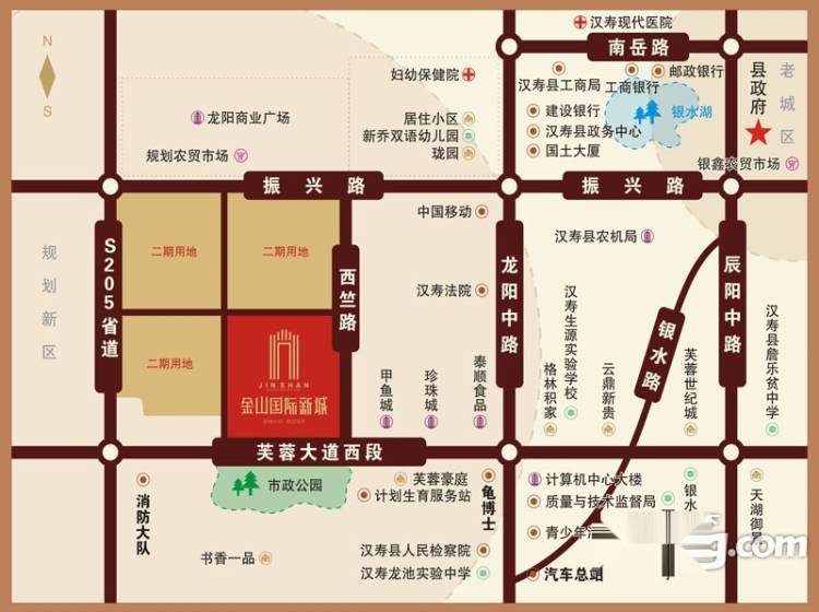 金山国际新城 覆盖立体式交通网络,纵横交错的交通体系可谓四通八达,项目纵有龙阳大道和新S205,横有振兴路和芙蓉大道,让您5便可直达老城区繁华区域,10无缝对接长张高速,同时项目靠近汉寿客运站,全天均有通往市县、县镇各个区域的交通车,同时金山国际新城公交站即将开通,为各位业主出行提供便捷的交通出行;这一片路网是汉寿一次进行完全黑化(沥青)路面。 同时与金山国际新城相邻的龙阳商业广场是购物、逛街的好去处,拥有肯德基、家润多超市、菜市等生活配套,满足您生活的方方面面需求。 金山国际新城 周围不仅能满足您的日常购物娱乐需求,同时汉寿新县医院与本案仅10距离,该医院是国家二级甲等综合医院,在汉寿各医院中医疗条件和环境都是好的,能为本案住户提供及时有效的医疗服务,而拥有50余年历史的汉寿妇幼保健院,也能为您家人的健康保驾护航。 在教育方面,汉寿龙池实验中学、汉寿县詹乐贫中学、汉寿生源实验学校、西竺山中学、银水路小学构筑2-18岁完整的教育体系.为业主的子女教育提供了更丰富的选择。