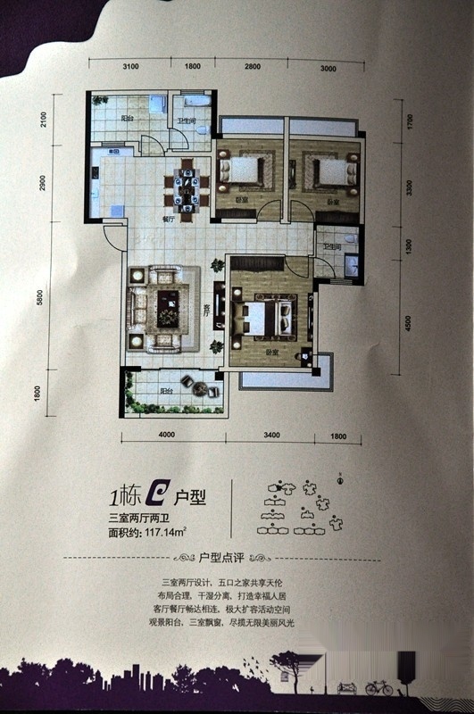 3室2厅2卫-1栋C户型 三室两厅两卫