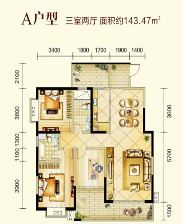 3室2厅2卫-万业城A户型 三室两厅两卫一厨