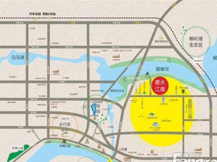 周边商业: 桥南、滨湖公园、下南门三大商圈 周边景观: 柳叶湖生态区、穿紫河风带 周边公园: 柳叶湖生态区、穿紫河风带、水上公园、滨湖公园 周边学校: 三闾学校 休闲场所,健身器材