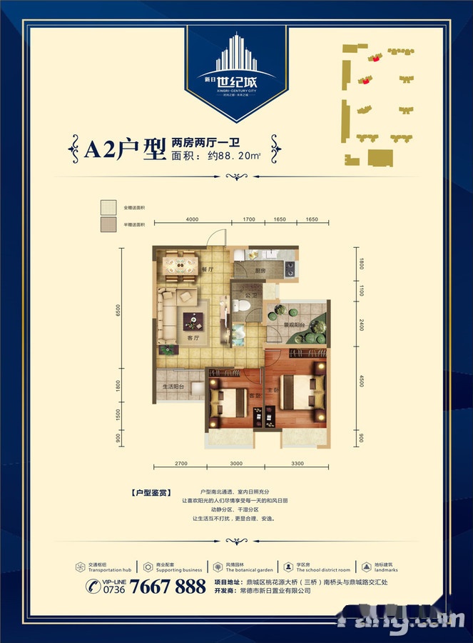 2室2厅1卫-新日世纪城—a2户型两室两厅一卫88㎡