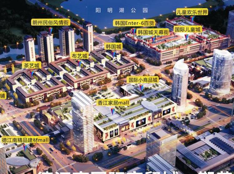 商场或超市:德江南国际商贸城拥有香江家居MALL、国际小商品城、国际服饰城、儿童欢乐世界、韩国城、茶艺城、糖烟酒副食城、布艺城、精品软装家居城等十四大专业市场构成,商业气息浓郁、命脉繁荣, 建成后将成为中南地区专业市场批发零售总源头,是中国商业地产领域最具投资潜力、最具运营实力的项目之一 医院:常德市第四人民医院南区 入住企业:该项目由香江家居MALL为主力店衍伸14个专业市场群为主体,构建成为湖南中西部地区最大最全的专业市场批发及零售集散中心。 项目除14大专业市场外,还拥有韩国Enter-6主力百货店、国际儿童城、韩国城天幕街、朗州民俗风情街、永安西路商业街、红云路商业街等城市商业综合体。 市场配备了高层公寓、写字楼、五星级酒店等于一体的商住并用休闲区,以满足各类人群不同体验。
