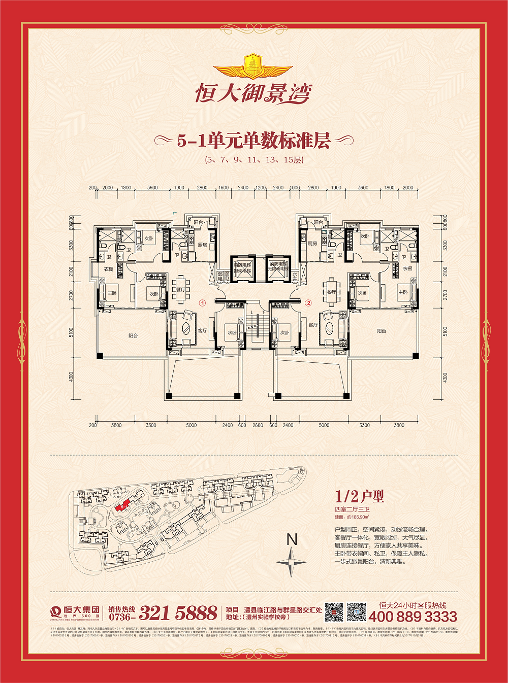 品牌地产、景观居所、湾区水岸、成品华宅。 1、区位:澧县恒大御景湾,位于澧县澧水北岸,临江西路北面,群星路西面,交通便利。2、环境:临近澧水沿江风光带,风景秀美;内部优雅园林,与建筑相互融合,创造一个舒适、悦目的生活环境;3、商业:打造配套商业街,涵盖购物、餐饮、娱乐等多种功能业态,满足业主日常所需;4、建筑:ART-DECO建筑外立面,典雅大气;5、户型:109-217㎡高层、洋房多种户型,满足不同居住需求。6、物业:金碧物业担任全程生活管家,提供全天候管家服务。7、品牌:恒大地产,23年筑房经验,实力雄厚。