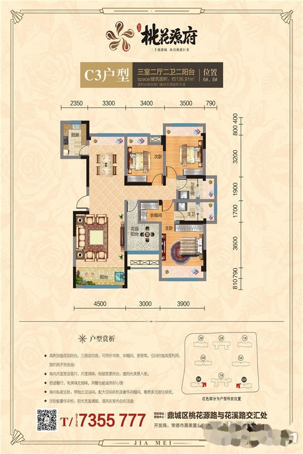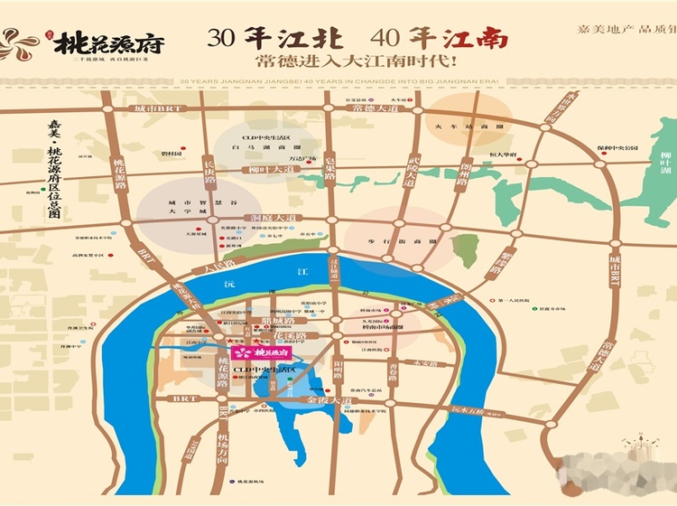 嘉美·桃花源府位于鼎城区桃花源路与花溪路交汇处,总用地面积120亩,总建筑面积25万平方米,规划为16栋,分两期工程开发,户型设计灵活,为105-160平米多样化户型,共计1448套。本项目坐拥三桥码头,占据城南核心板块,三桥一路直通市区、机场、多条高速汇聚、城市BRT无所不至,交通、地理条件优越,具备巨大发展及升值前景;江南小学、花船庙小学、淮阳中学、朗州实验学校、江南实验学校、鼎城一中等教育配套优越、完善,尽享优质学区资源!