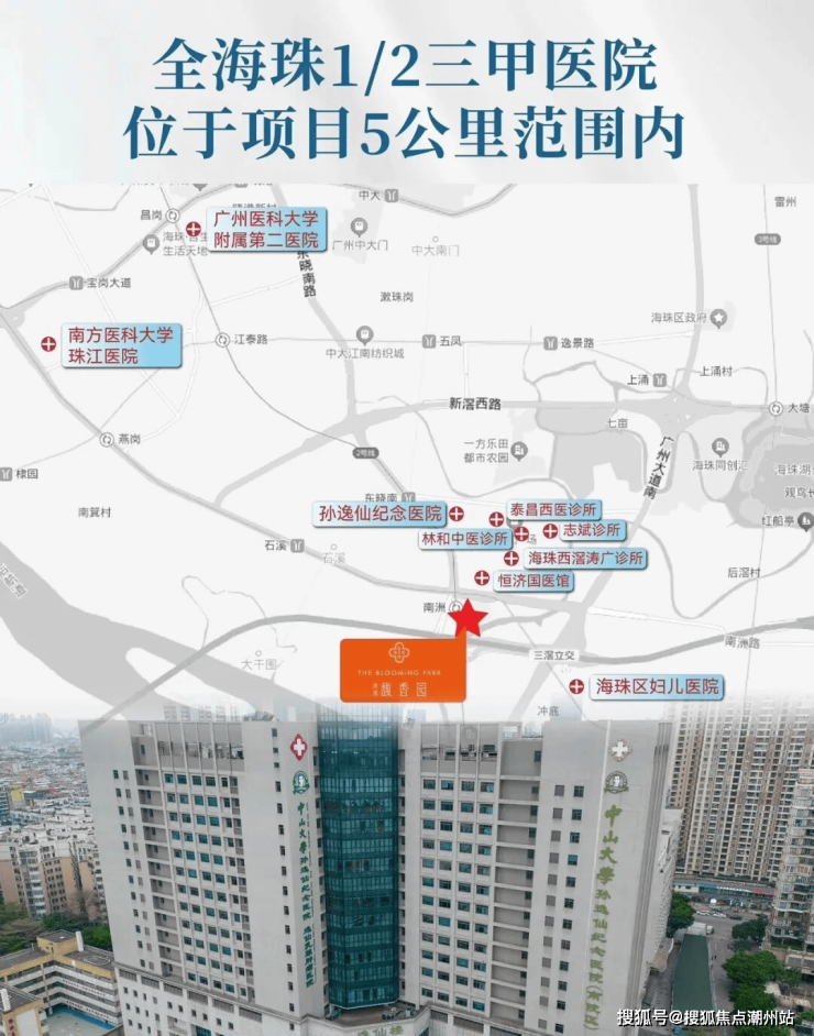 医疗配套约750米中山大学孙逸仙纪念医院(三甲)约1.5公里海珠区妇儿医院约3.5公里南方医科大学珠江医院、广州医科大学附属第二医院。