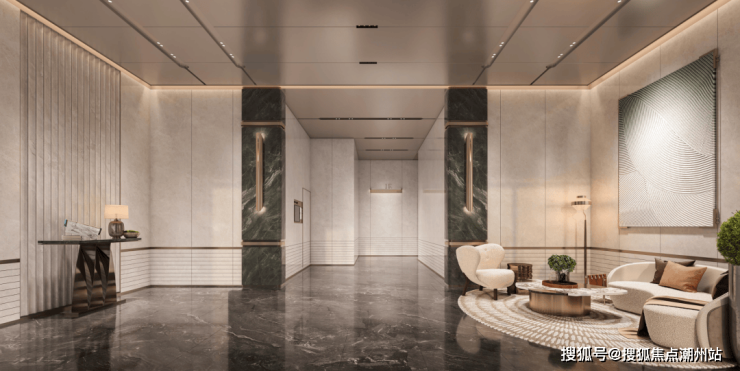 电梯轿厢的细节更见用心:墙面用编织纹理皮革仿板拼接天然大理石,指尖划过能触到细腻肌理。甚至连负一层的动线都苛求完美:车马厅的普拉达绿大理石柱如仪仗般列阵,艺术感扑面而来;大堂用宝格丽棕大理石搭配米色仿石材瓷砖,让业主从下车到入户的每一步,都能感受到被珍视的体面。