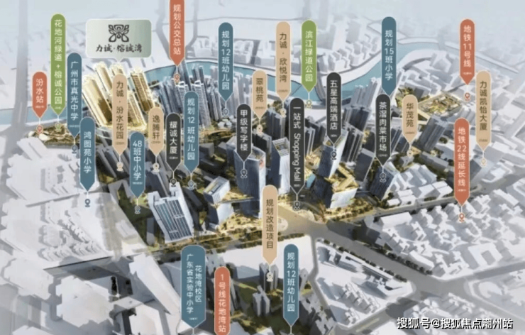 力诚榕诚湾属于茶滘旧改项目,位于荔湾花地河以西,广州香料厂以南地段,北侧有一座高架桥,东邻汾水花园和真光中学,西侧为芳村的花地河。位于白鹅潭商务区核心区,涵盖35个地块,占地约54万㎡,总建筑面积超200万㎡,是主城罕见的大规模连片开发的城市更新项目。将新建16个高端住宅社区,2间学校和3间幼儿园,以及合计60万㎡高端商业,内部规划“一心三脉”四大组团。