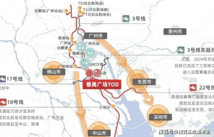 广州保利琅誉坐落于番禺广场TOD的核心区域,傍雁路附近,距离正在建设中的地铁3号线东延段滂江站直线距离不到600米,步行大约1公里,目前施工进度已达90%,预计明年通车。这意味着在您收楼之前即可享受到便捷的轨道交通服务。从滂江站出发,不仅可以直达珠江新城,还能一站抵达番禺广场换乘18号线和22号线,大大缩短了前往广州主城区的时间成本。