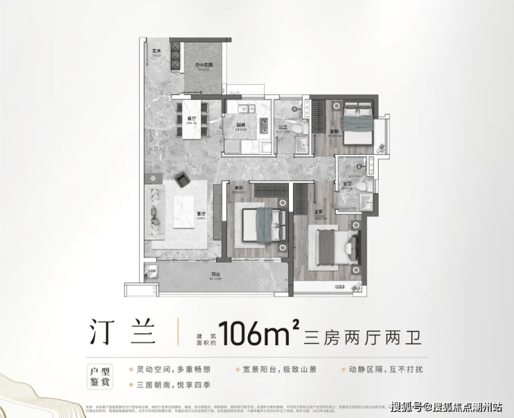 南北对流,106㎡舒适三房,高效实用空间,满足大家庭需求,阔景阳台,四季景观尽收眼底。