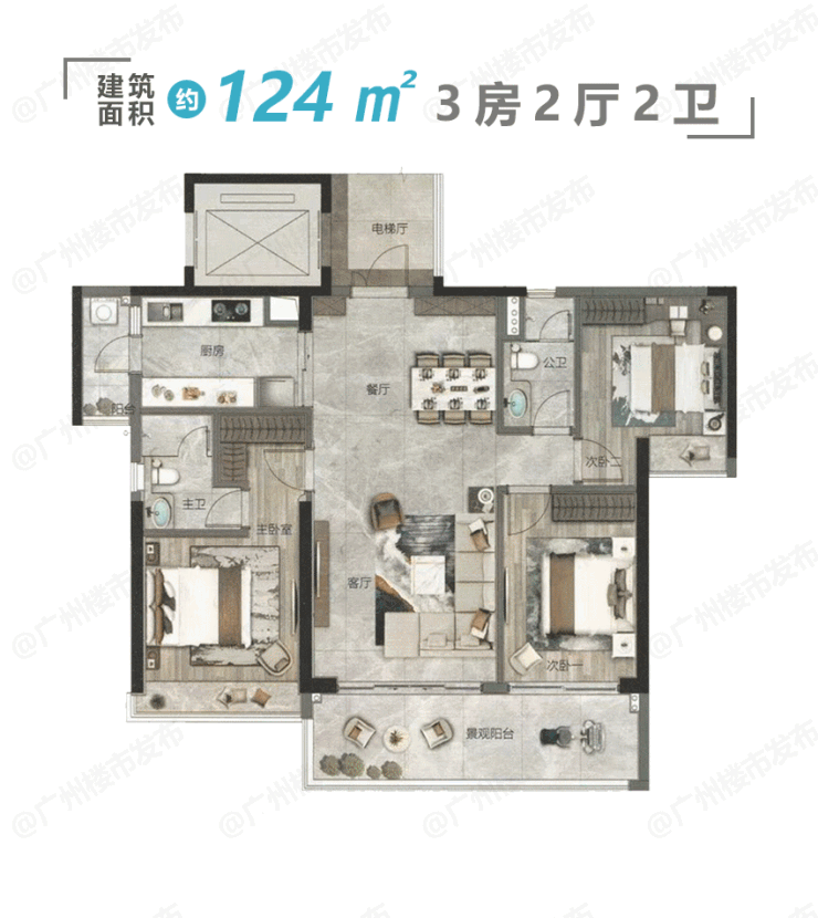 户型产品:约 124 ㎡ 3 房 2 厅 2 卫(4-5栋)