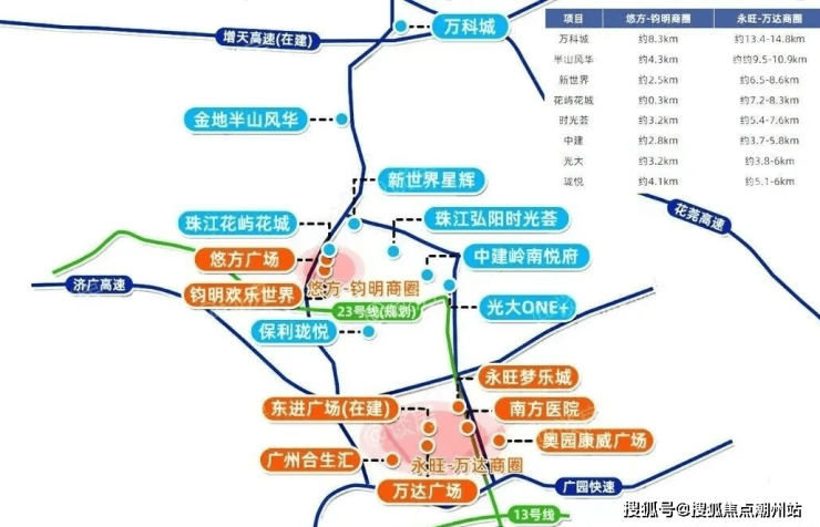 商业配套项目的商业除了依靠小区底商,周边还有一个是以合景悠方和钧明欢乐世界为主的商圈,另一个是以永旺梦乐城和新塘万达为主的商圈。