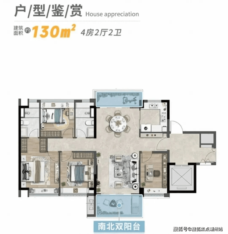 建面130平四房两卫,四开间朝南,南北对流,舒适度较高,双阳台,可打通客厅旁的房间做成大方厅。