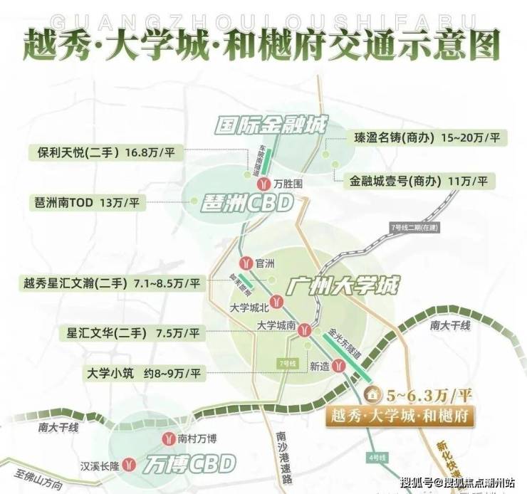 大学城和樾府销售中心距离最近的地铁站是4号线新造站,走路过去地铁站也就是900多米,坐地铁4站可到万博,琶洲,5站金融城。自驾方面也是很方便的,南大干线已经开通,串联起广州南站、汉溪长隆、万博CBD、大学城、国际创新城、广汽基地等番禺核心板块,5min直达万博中心;金光东隧道已经通车,5min直通大学城一期。同时也 让一二期资源得以链接、整合,真正融合成为一个整体。