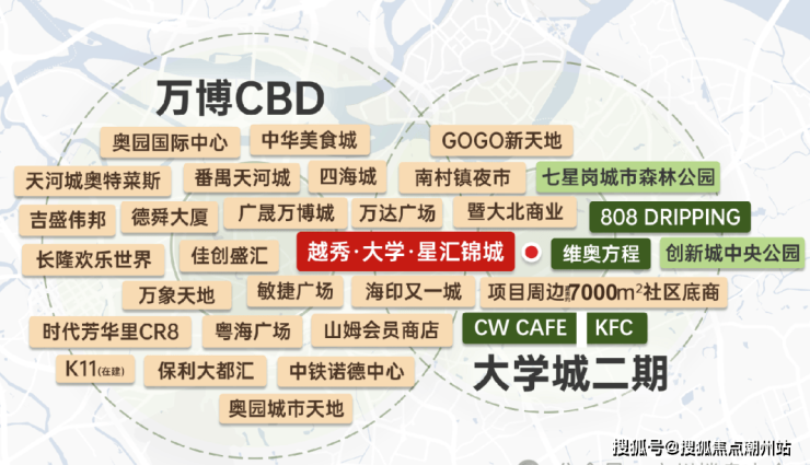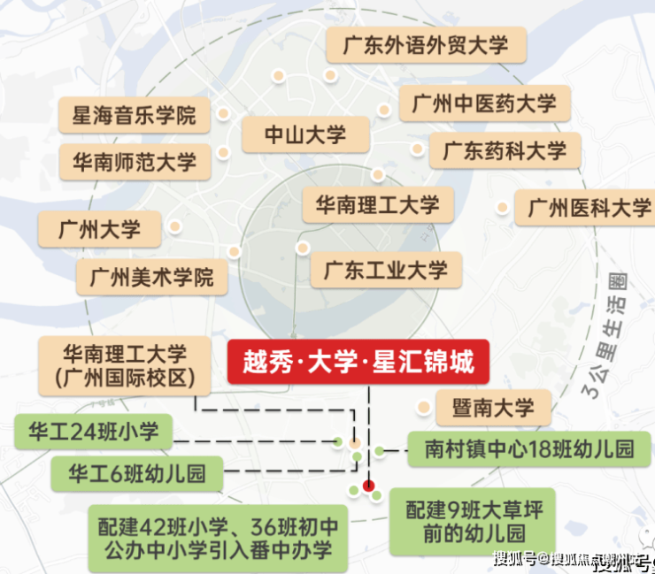 越秀大学星汇锦城属于番禺大学城二期板块,大学城板块从无名小岛到国内顶尖大学园区,板块内的居民主要是教师、教授和地铁4号线琶洲外溢人口。项目从拿地至今短短一年半,教育、公园、商业街、地铁接驳巴士都陆续兑现了。