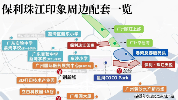 地铁:距离在建的地铁 10 号线东沙站约 700 米,预计 2025 年开通,开通后 4 站可达中大,6 站直达滨江东,零换乘直通珠江新城;1.3 公里处为已开通的地铁 11 号线环线,可快速通达中心五区。