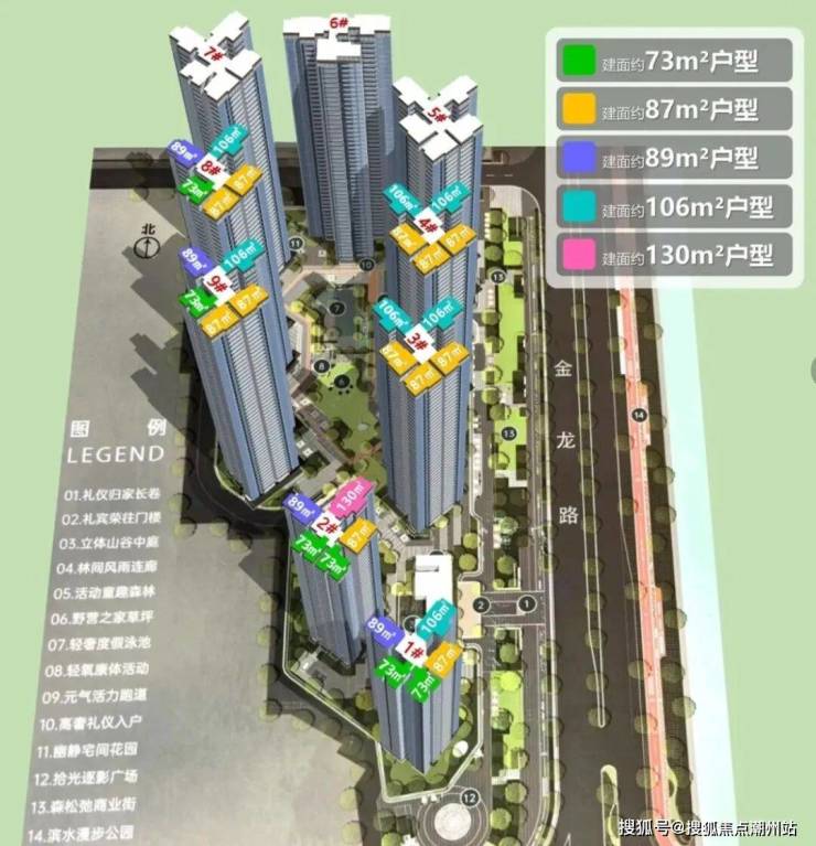 总规模:约68万㎡ 一期基础信息: 占地面积:11.5万㎡ 建筑建面:约28.48万㎡ 容积率:1.39 绿化率:35% 一期1地块户数:约1120户 户型面积:建面约73-130㎡全南向4/5空间两厅两卫 梯户比:1-2栋2T5,层高:32层,3-4栋3T5,层高:42层,8-9栋3T5,层高47层。 车位比:约1:1.1
