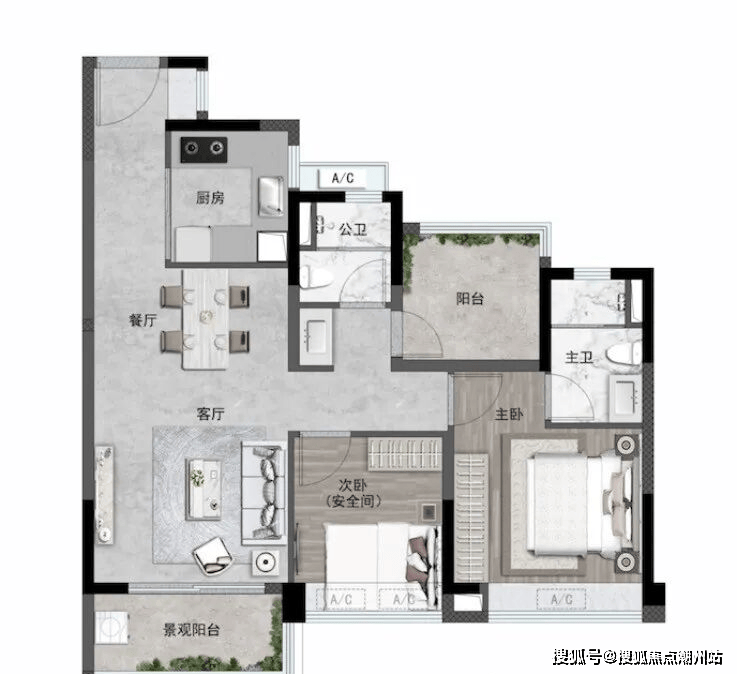 全屋多达6处飘窗赠送,主卧正面飘窗+转角飘窗、玄关飘窗、次卧飘窗、公卫飘窗