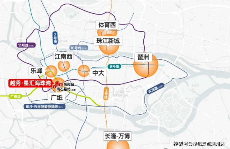 越秀·星汇海珠湾位于广州五大主城区之一的海珠区,现成地铁广佛线燕岗站附近;海珠创新湾头部发展区域,广纸新城核心腹地,坐拥千年羊城繁华,未来创新湾将承接广州城央高净值人群的消费、娱乐、居住等需求,是广州全市风水最旺处,为云山环抱处,和珠水汇聚。广纸所在片区为“玉带环腰水”格局,居者非贵则富,多主事业成功、财运亨通,赚钱比较容易,且能积聚致富。