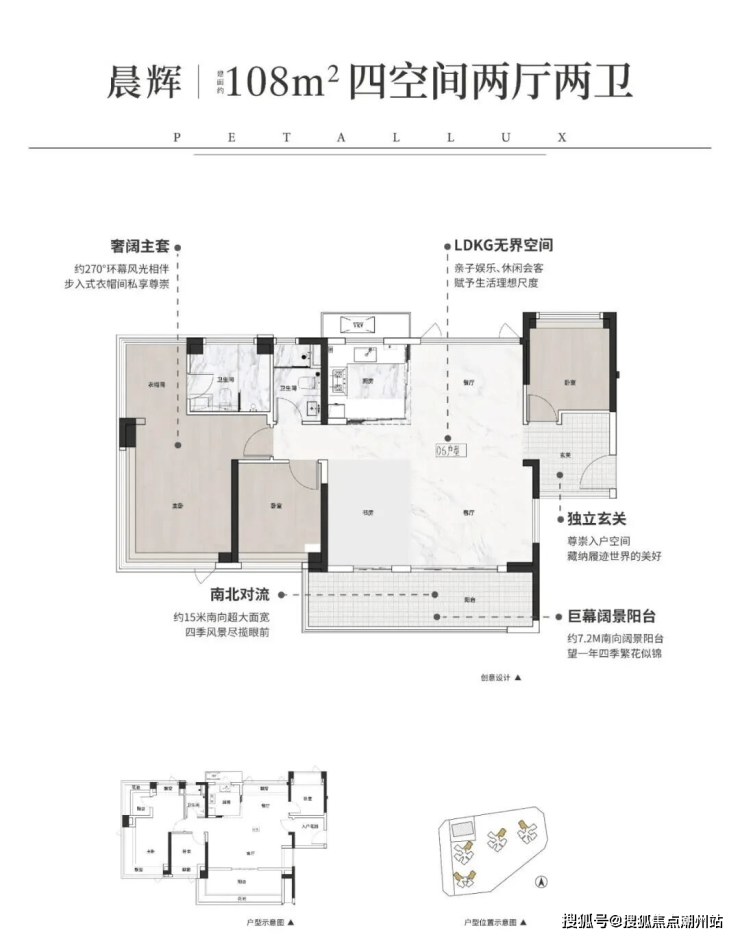 108m²户型尺度更大,做到南北对流同时,拥有7.2米长的大景观阳台,大面积主卧可放1.8米大床,并带更大的独立衣帽间,整体灵活性更强。