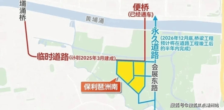 自驾方面,一是临时道路,会搭设黄埔涌便桥,连接琶洲中区,计划2025年约一季度建成;二是永久道路,地块周边一共涉及7条,计划2026年约四季度建成。其中最关键的是会展东路,直达广交会展馆,又可串联新港东路、阅江路等,便捷通往珠江新城、金融城。