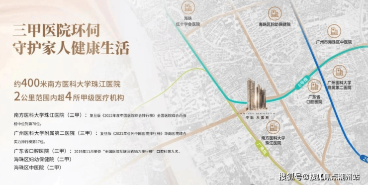 距离项目500米就是南方医科大学珠江医院,周边还有广州医科大学附属第二医院、广州市红十字会医院、广东省口腔医院等多家三甲医院。