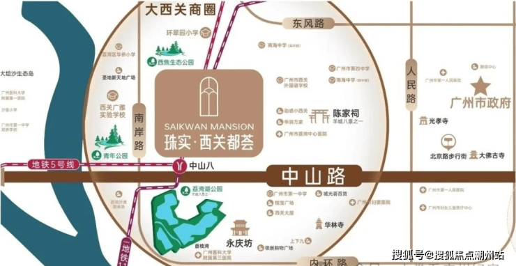 项目距离地铁5号线直线仅约500米,周边还汇聚5+11号线和34条公交线路,5号线可直达珠江新城、金融城。11号线作为内部大环线,能一线直达火车站、广州东站、琶洲、白鹅潭、广船等重要板块。自驾通过南岸路与中山八路交汇处,无缝衔接中山路、东风路、环市路等城市主干道。