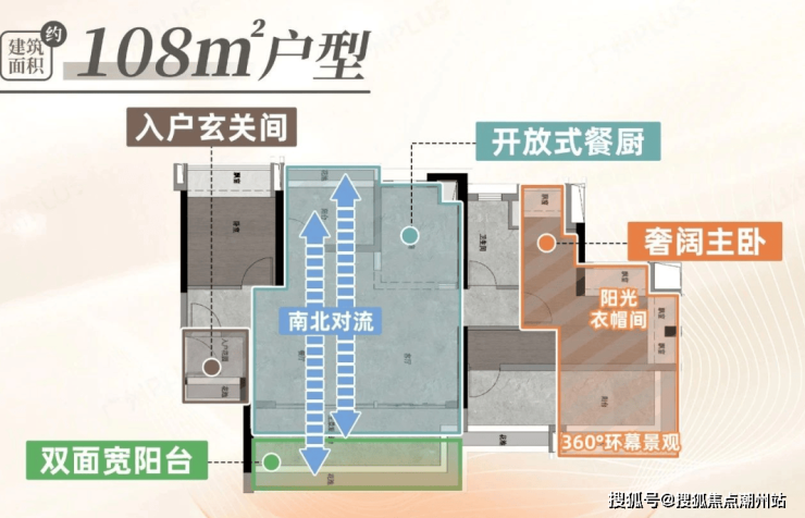 建面108平四房,带入户玄关,五开间朝南,还做到了南北对流设计,主卧带衣帽间。