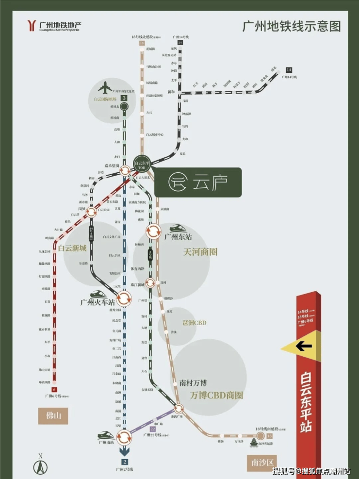 交通配套三轨道汇集TOD,2站天河北 | 3站珠江新城。时速在160公里的高速地铁线,在全国也仅开通了三条,云庐所在的白云东平站。正是这18号线高速地铁所在,作为跨市域地铁线,通达广州,更可畅行大湾区。广州地铁18号线北延段(在建中):一轨串联广州东站、琶洲、珠江新城、万博中心、南沙副中心等核心CBD区,畅达大湾区中山/珠海/香港/澳门等区域,一轨串联湾区核心城市。广州地铁14号线(已开通):一站广州2/3号线嘉禾望岗站,实现5站机场,畅达广州各大区域,14号线延线直达广州火车站。佛山6号线(规划中):联通广佛城际交通,自白云东平站连接大沥、桂城、陈村、佛山新城等板块,串联广佛实现同城联动。白云东平站和公交总站上盖,拥有专属地铁归家通道,享受两种交通模式,无风雨,无温差,归家舒心便捷。