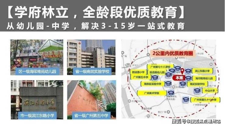 教育资源优质公立教育,3-15岁全方位解决。幼儿园:海印南苑幼儿园、海鸥幼儿园、前进路幼儿园;小学:滨江东路小学(今年划分)、前进路小学;中学:省一级广州第五中学(今年划分)、省一级南武实验中学、广州市第九十七中学、广州市第七十八中学、广州市海珠区实验中学;大学:中山大学、广州美术学院。