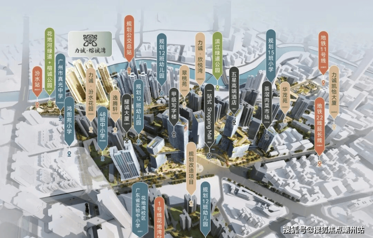交通配套项目距离最近的地铁1号线花地湾站约1.8公里,距离坑口站1.9公里,距离规划中的汾水站600米。后期茶滘公交总站就在楼下,3站到芳村,对越秀上班族还蛮友好的。如果是自驾的话,周边有茶滘路、花蕾路、芳村大道等干线,约2km洲头咀隧道/珠江隧道,花地大道和芳村大道在侧。花海路(榕诚湾段)正式接驳浣花西路、连通花地湾地铁站的喜鹊路同样已打通,使地铁与项目的距离缩短至1公里左右。