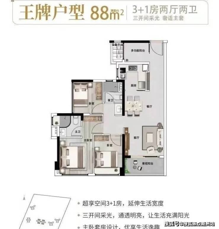 建面88平横厅3+1房,四开间朝南,南北对流,整体采光面超9米,L型厨房,客餐厅一体化,总价480-500万左右。