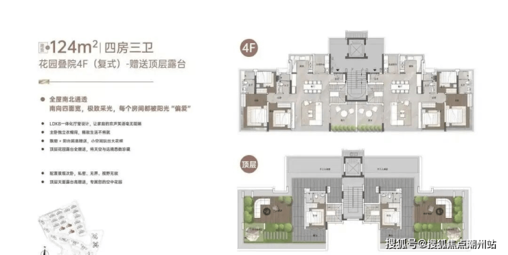 这是最接近墅级形态的户型,下层做了侧花园设计,顶层的天面露台全赠送,实现了约242%的使用率。