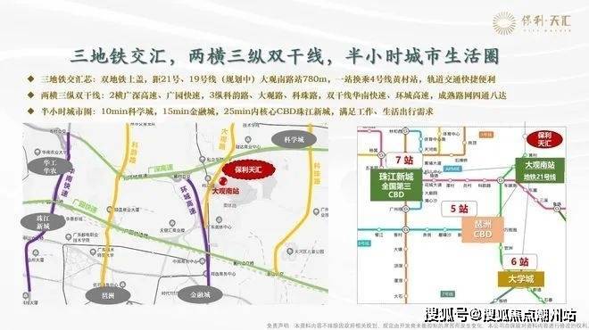 地铁方面,项目距离地铁21号线大观南路站约1.2公里,步行约20分钟,可1站换乘4号线,直达金融城、琶洲,4站到员村换乘5号线,快速接驳珠江新城。自驾方面,周边有华南快速,广深高速、广园快速、大观路、机场第二高速(在建),可在40分钟内通达广州各核心城区,尤其是前往金融城、珠江新城、琶洲等地,通勤便利度高。