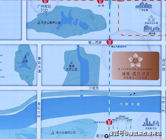 揽江印月是位于大夫山和市桥板块交界处的沙头片区,属于番禺市桥板块,临市桥水道,西面是莲湖湿地公园,所处地块是2022年由番禺交投以总价约14.3亿元,折合楼面价约1.34万元/㎡拿下的番禺区沙头街禺山大道南侧STJ15-02地块。