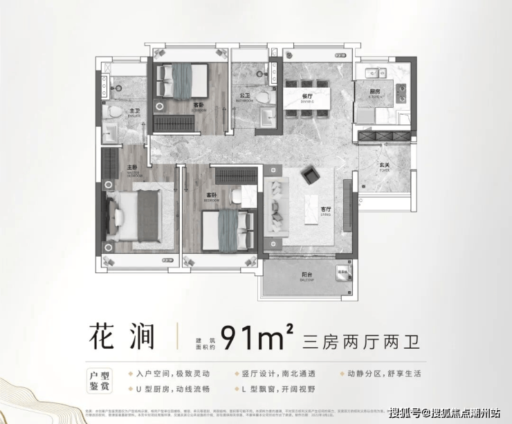 户型鉴赏高性价比,91㎡爆款三房,舒适三房,对流设计,动静分明,实用率高。