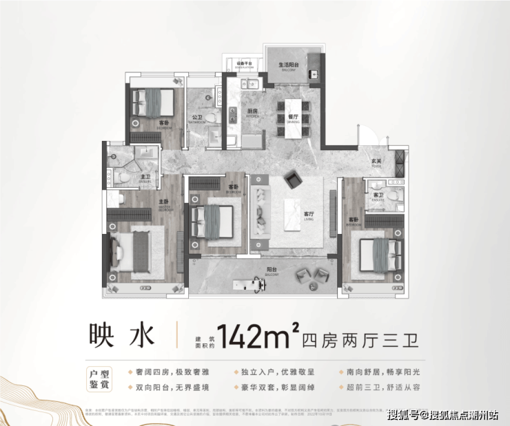改善首选,142㎡奢阔四房,板式设计,南北对流双阳台,两梯两户,近4米客厅以及约6.7米阳台的宽度,融接山林风光,广州罕见的高舒适度产品。