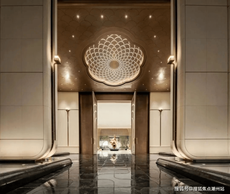 对称仪式感的六扇瑞兽纹墙,庇佑业主归家。正前方约7.5 米高的气派铜门,由我国国宝级非遗大师朱炳仁先生锻造,一扇门融入了多种非遗铸铜工艺