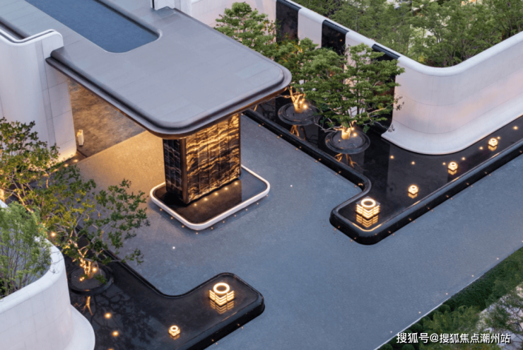 水庭底部采用安哥拉黑奢石打造,两旁六颗树龄百年红果冬青树,正面是宇宙黑金奢石打造的照壁,归家门面极富尊贵感。