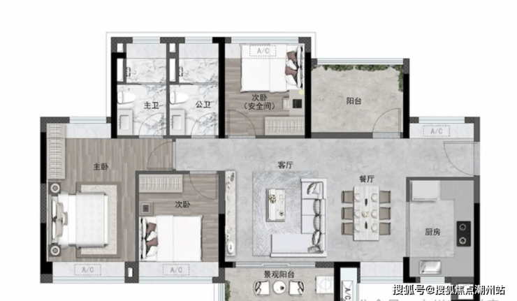 全屋多达6处飘窗赠送,主卧正面飘窗+转角飘窗、玄关飘窗、次卧飘窗、公卫飘窗
