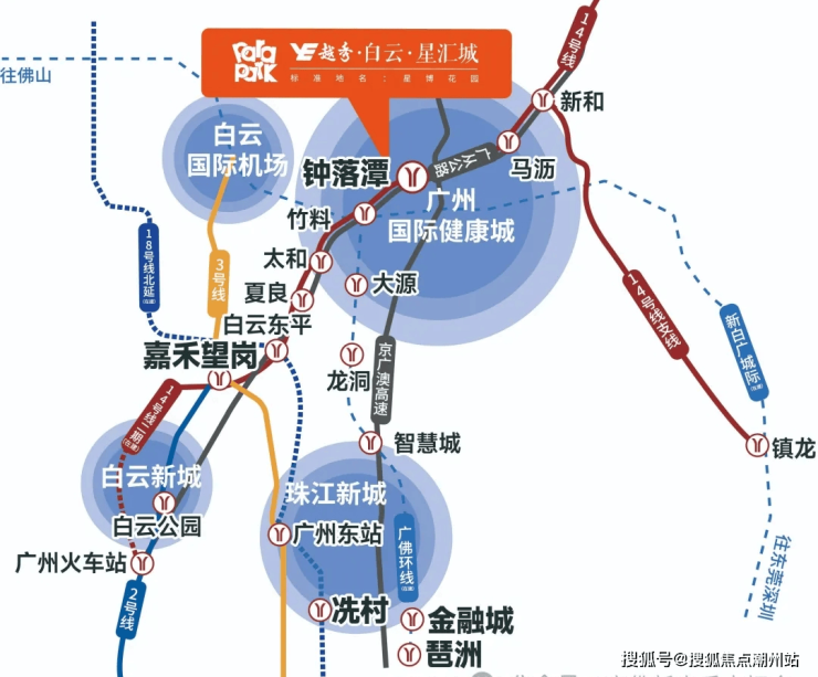 项目位于地铁14号线钟落潭站旁,5站到嘉禾望岗,换乘2、3号线可直通白云新城和畅达广州全城;14号线二期(在建中)不换乘直达广州火车站;18号线北延段(在建中),在白云东平站与14号线交汇,7站即可到冼村。