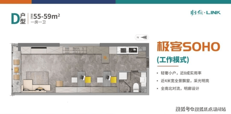 实用率近80%,打造全生命周期百变极客空间,全明廊设计270°全景采光,南北对流通透舒适。