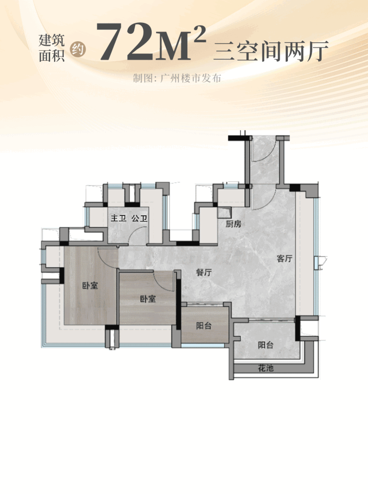 先说升级版的建面约72平三空间两卫户型,背靠约5000亩龙头山森林公园,无遮挡直面中心大草坪,景观和视野都非常开阔。