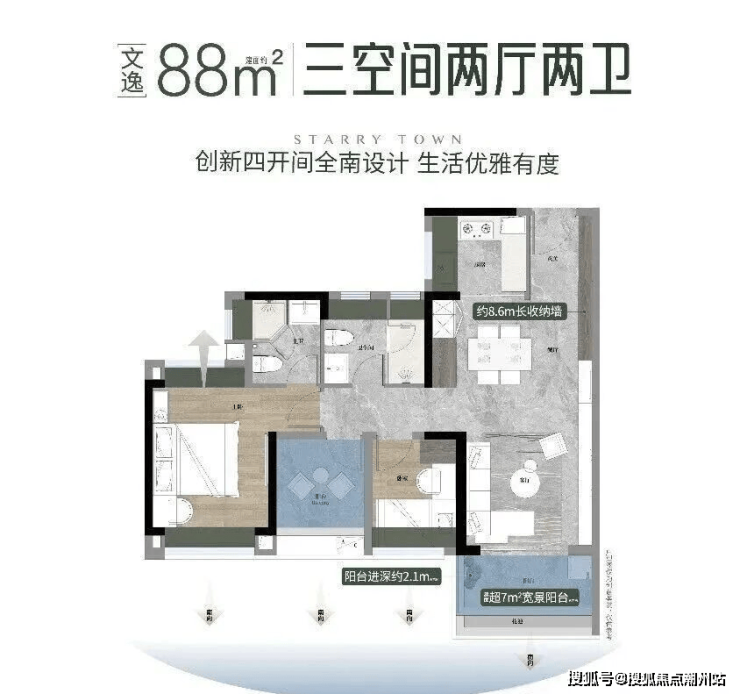 【88㎡ 3空间2厅2卫】罕见四面宽小户型,朝南居家生活。三卧室朝南,超11米景观线,与阳光无限亲近。精细化收纳,约10米收纳墙,藏纳全家人的爱好。
